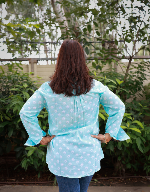 Aqua Blue Bandhani Cotton Shirts with Contrast neck & hand Collar